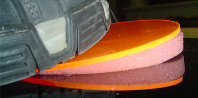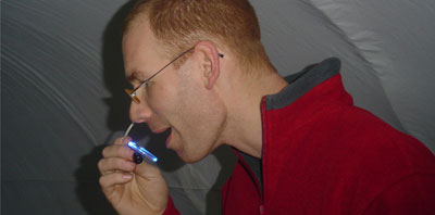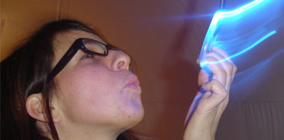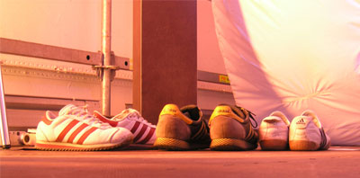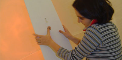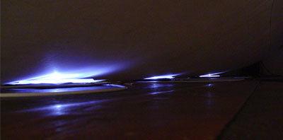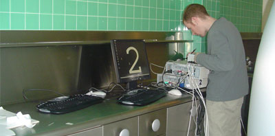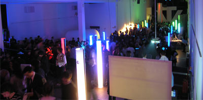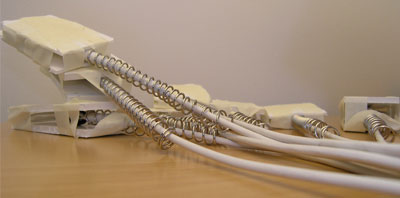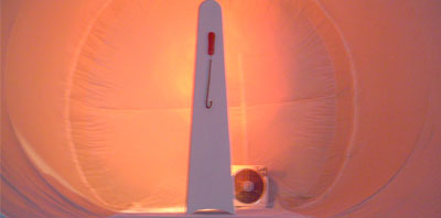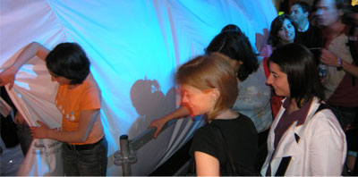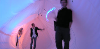 A person would go into the inflatable space, pick up the receiver ad press a button located at shoulder-height on the phone stand. The button was hooked to a USB mouse that triggered the recording, the playback and the panning. The message would be played back through two speakers sewed on the ceiling of the inflatable. |