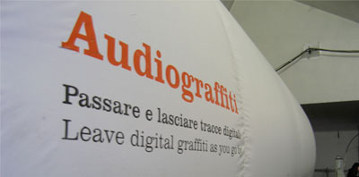 Audiografitti is an installation that illustrates how a space changes over time. The installation is placed in an inflatable space, featuring two parallel sets of four microphones, four corresponding switches and four speakers.