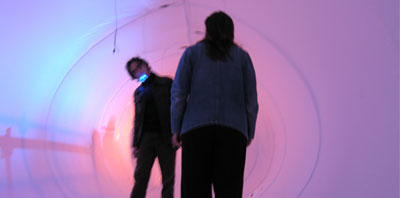 When a person comes into the inflatable space, they can activate the microphone by pressing the switch on the floor. They can then leave a message which will be played back and looped in that specific point of the space (stereo field), according to the position of the microphone.