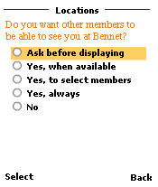 For example, should all members automatically be able to see when the user is at this location, or maybe the system could ask her first if she wants the information broadcasted?
