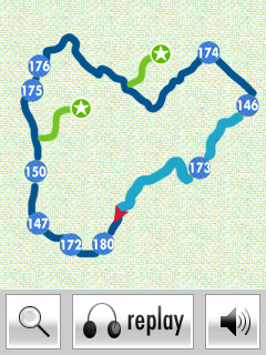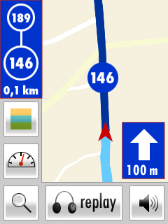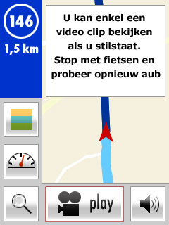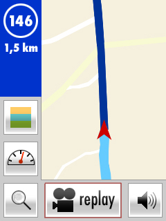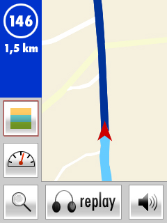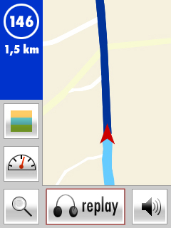 The main screen of the application shows a zoomed-in map of the tour, where the biker (the red arrow) is always in the middle. The next node point and the distance to it are shown in the blue box on the left corner of the screen (first image to the left).