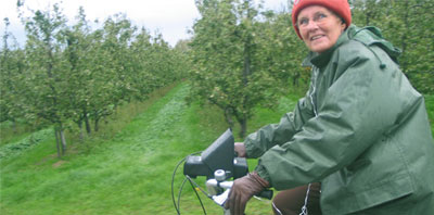 When the biker is approaching a new node, the same blue box will display: the node to be reached (bigger), the distance to it, and the next node the biker will follow. The arrow in the low right side of the screen signals that an intersection is approaching, the distance to it and which way the bikers should turn. The nodes are not necessarily located in intersections (second image on the right). |