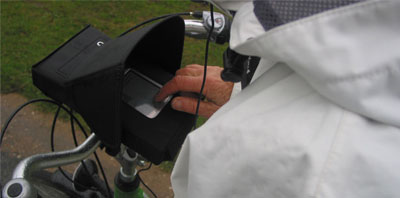 The application ran on a PDA attached to the bike handlebars. The user could interact with the application through the touch screen. The main screen of the application provided navigation support (using the GPS technology). Since the application was designed to run on pre-defined bike tours, the directions were fixed, and there was no search function.